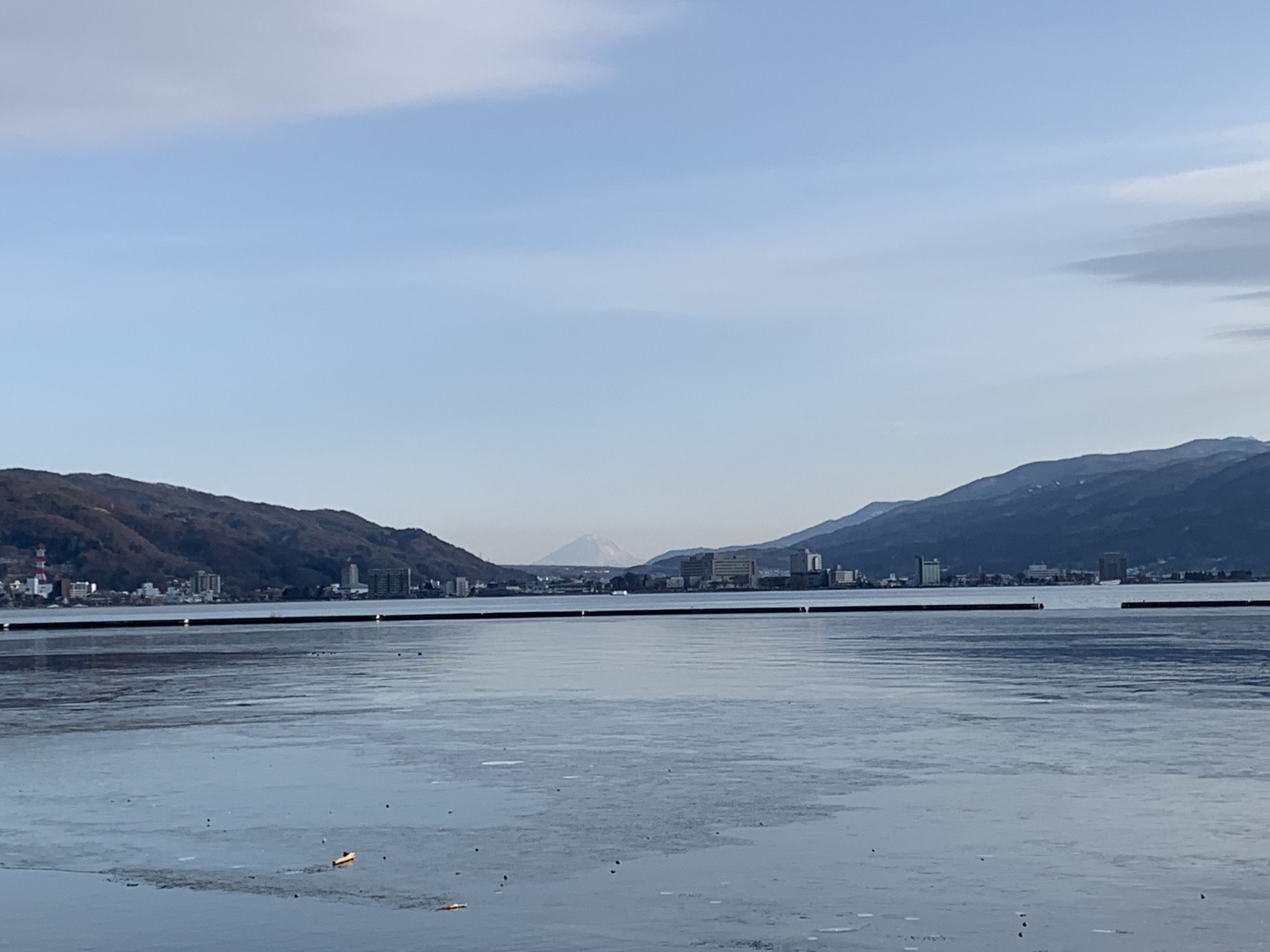 なぜか探してしまう富士山ですが、諏訪湖畔でも下諏訪エリアでは、条件が良い日にはかなり良く見えます。画像にするとややボヤっとしますが、実際には結構感激すると思います。